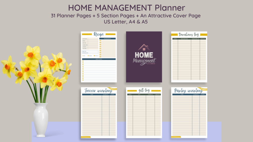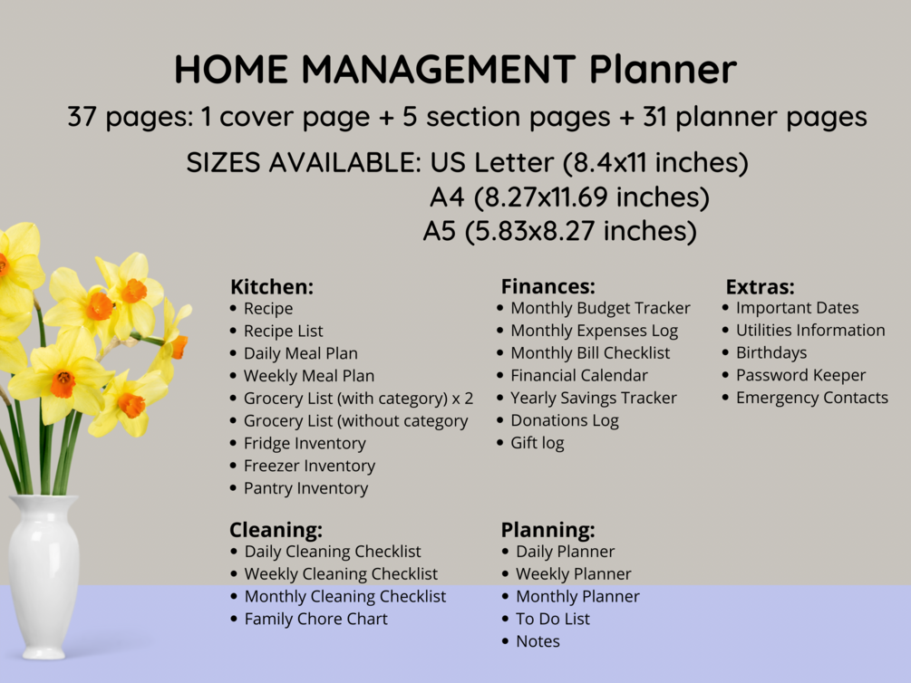 With our House Management Planner, you can forget about the headache that comes with organizing your home; this planner is designed to help you take control of your space by giving you an easier way to know what you have, what you need, and what you need to get rid of. A life-changing planner which allows you to cut the clutter in your life by managing your home, schedule, errands, chores, and more; It offers you a totally customizable system that fits your needs, giving you control over how you manage your home.